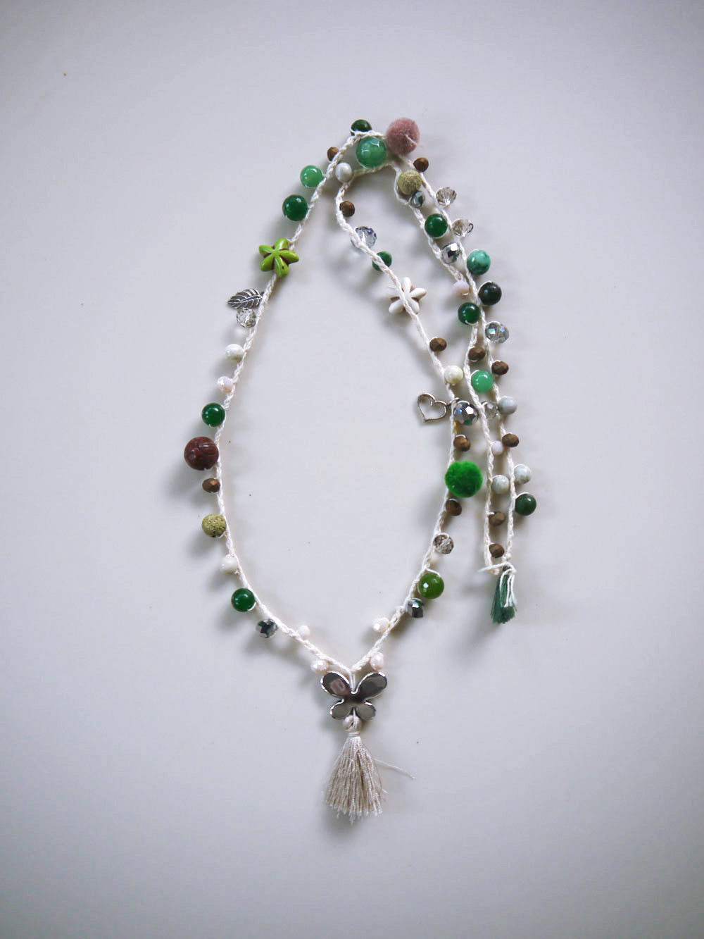Collana di pietre costituita da 62 elementi tra pietre dure, cristalli di boemia, perle in vetro, perle naturali in legno, elementi in metallo e altri elementi particolari.